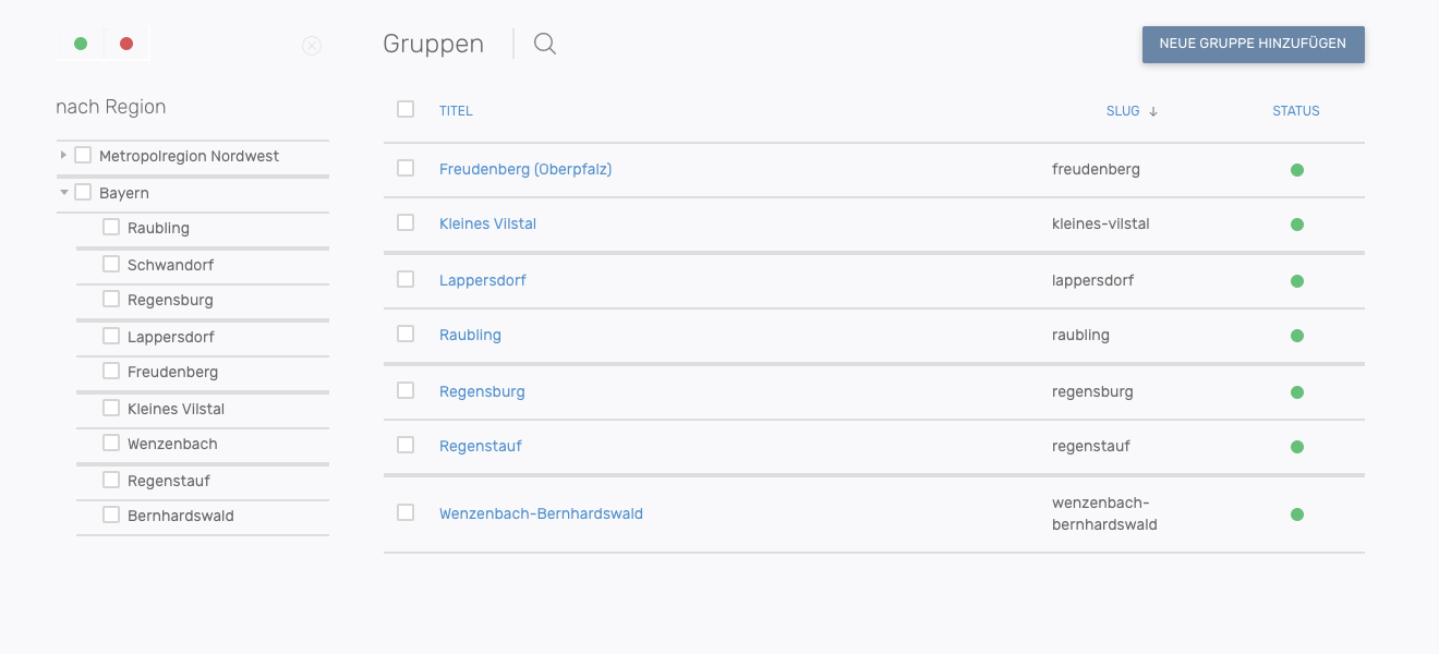 Die Gruppen Ansicht zeigt einen Überblick über alle eingetragenen Gruppen. Es bietet sich hier die Möglichkeit nach Gruppen zu suchen (), Sie zu filtern und auch neue Gruppen hinzuzufügen oder zu entfernen.