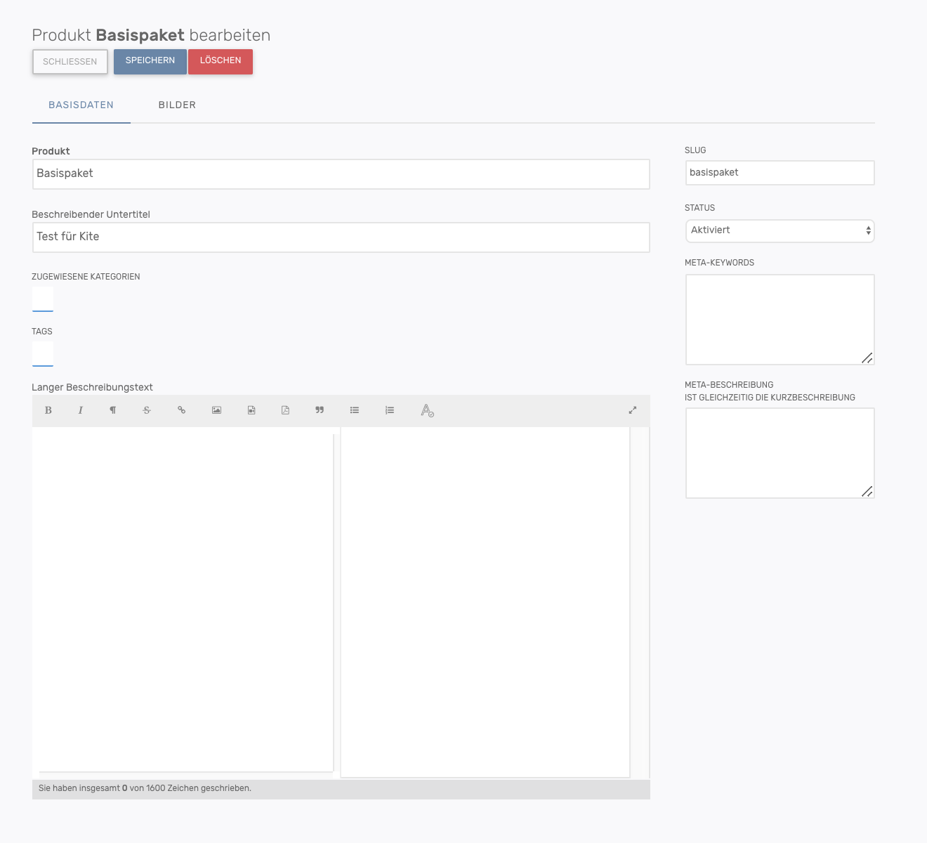 Ein Produkt hat die Daten Name, Untertitel, Kategorien, Tags, Beschreibung, Slug, Veröffentlichungsstatus, Meta-Keywords und Meta-Beschreibung.