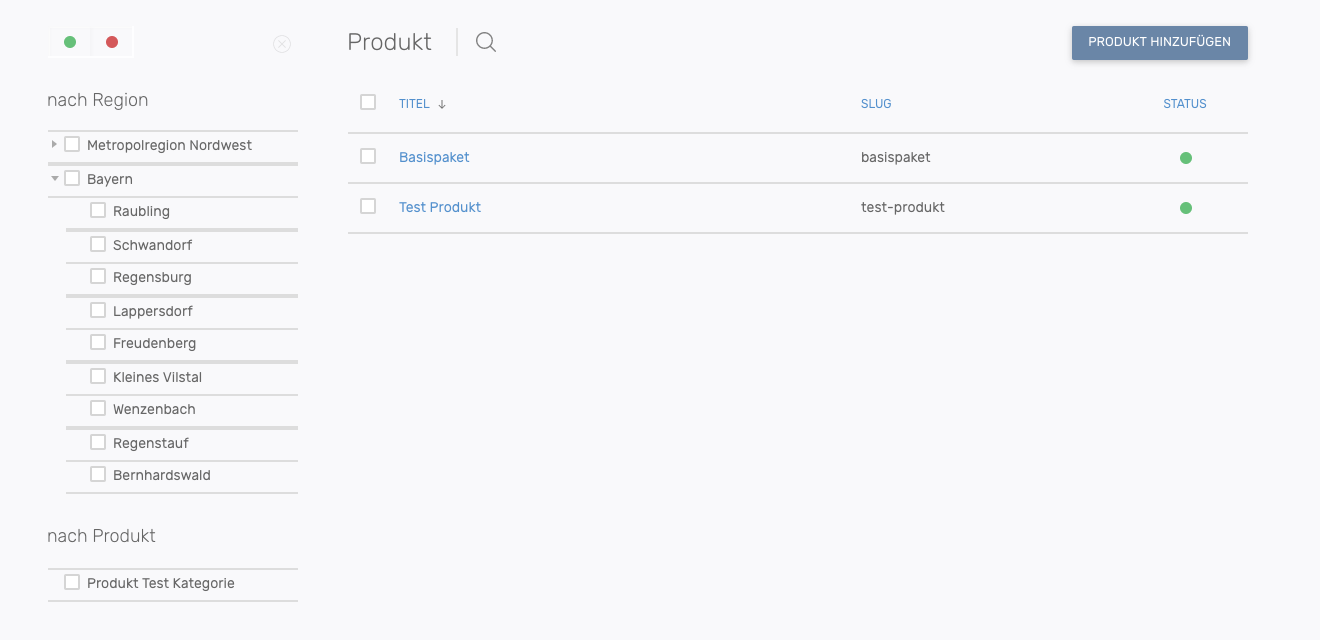 Die Produkt Ansicht zeigt einen Überblick über alle eingetragenen Produkten. Es bietet sich hier die Möglichkeit nach Produkten zu suchen (), Sie nach Region und Veröffentlichung zu filtern und auch Produkte hinzuzufügen, zu entfernen, zu duplizieren, zu veröffentlichen oder die Veröffentlichung rückgängig zu machen.