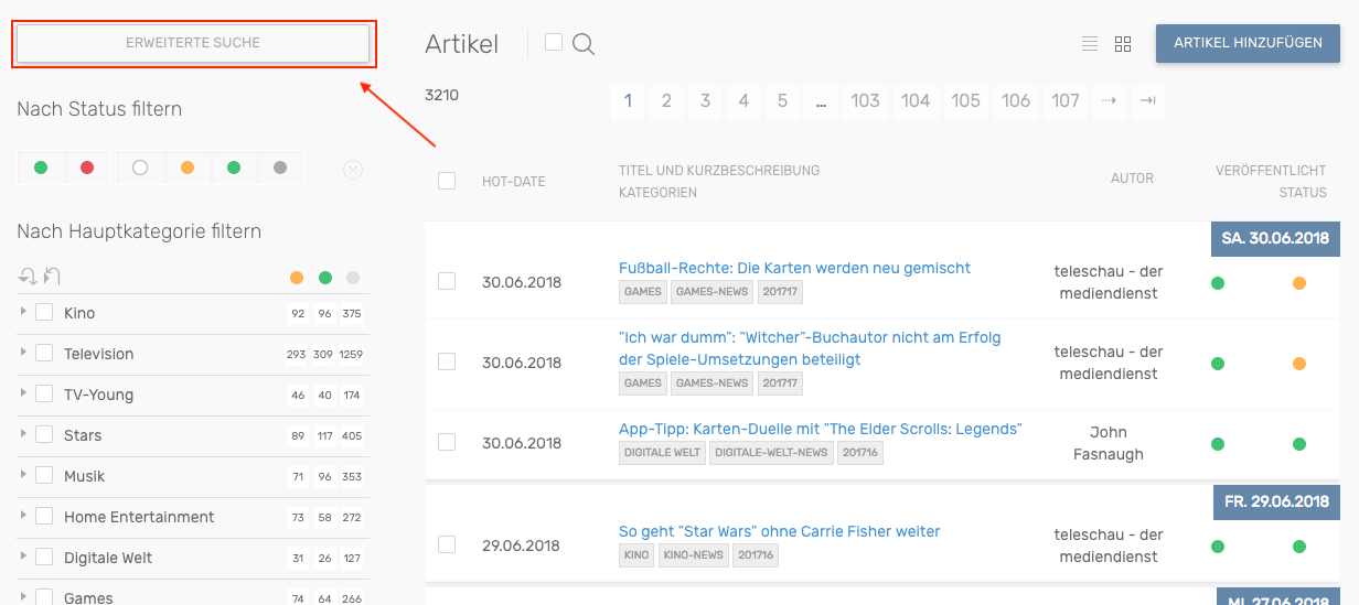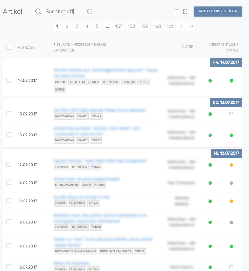 Der Veröffentlichungs-Status der Artikel kann direkt in der Liste gesetzt werden. Ein Klick auf • veröffentlicht den Artikel sofort. Ein erneuter Klick setzt den Artikel wieder auf unveröffentlicht.
