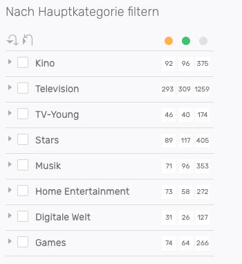 Der Kategoriefilter zeigt automatisch die Summe der Artikel in den Kategorien an. Für jede Kategorie werden die Anzahl der fertig gestellten und der überprüften Artikel angezeigt. Die dritte Anzeige ist die Summe aller Artikel in der Kategorie.