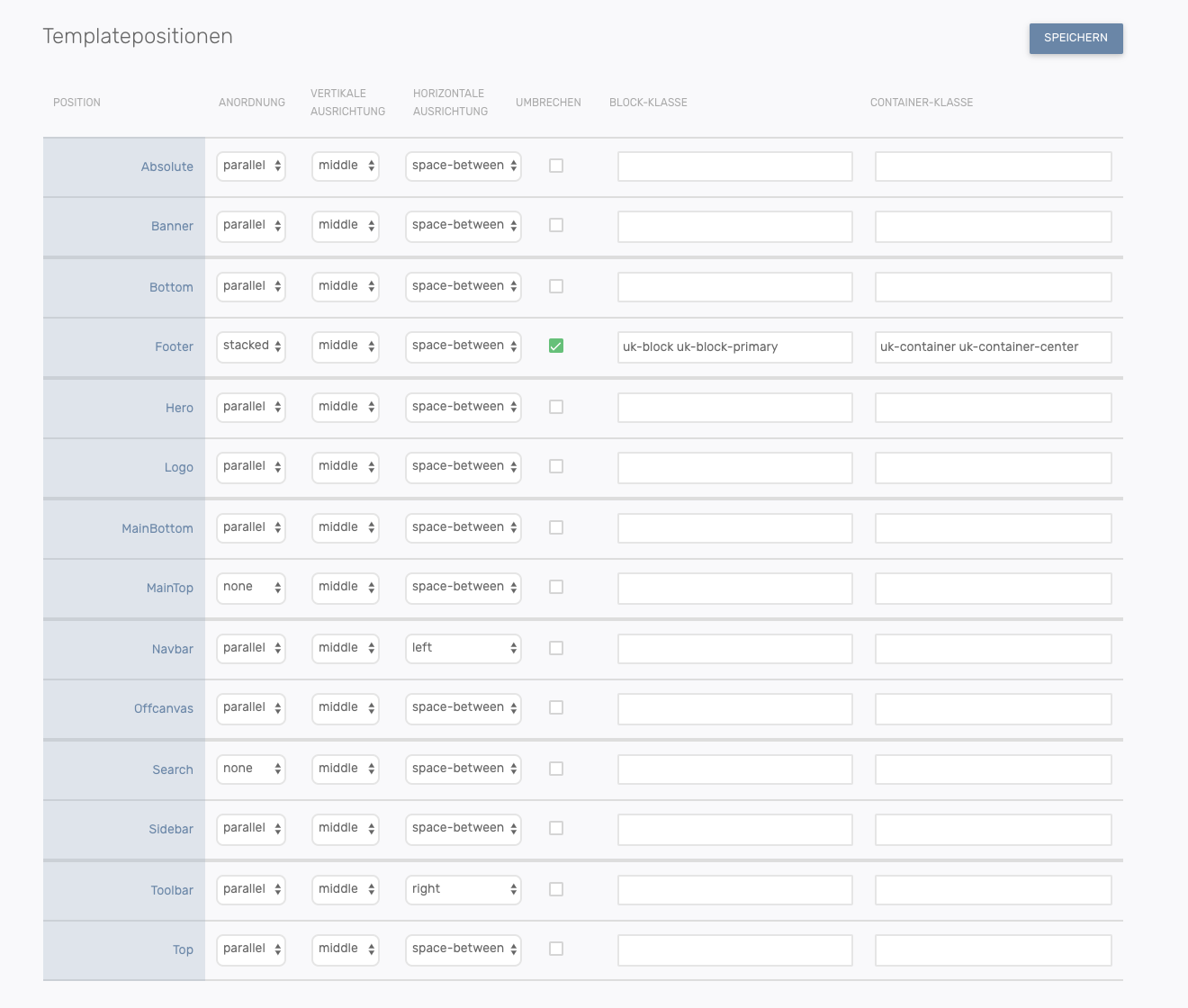 Die Template-Einstellungen beziehen sich auf die Positionen, die in der Template-Konfiguration definiert und installiert wurden. Die Darstellung der Positionen kann deshalb von der Darstellung in diesem Handbuch abweichen. Die Installation von Templates erfolgt mit der mozaikoo-Desktopanwendung.