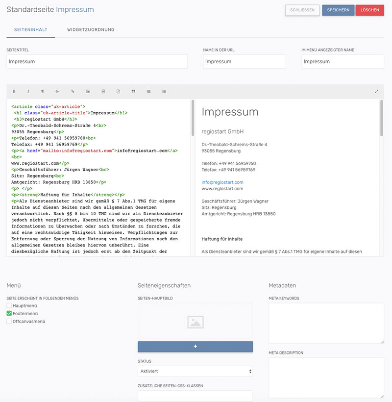 Unterhalb des Editors können Menüzuweisungen eingestellt, ein Ansichtsbild der Seite zugeordnet, der Status geändert, CSS-Klassen hinzugefügt und Meta-Daten zur Seite eingegeben werden.