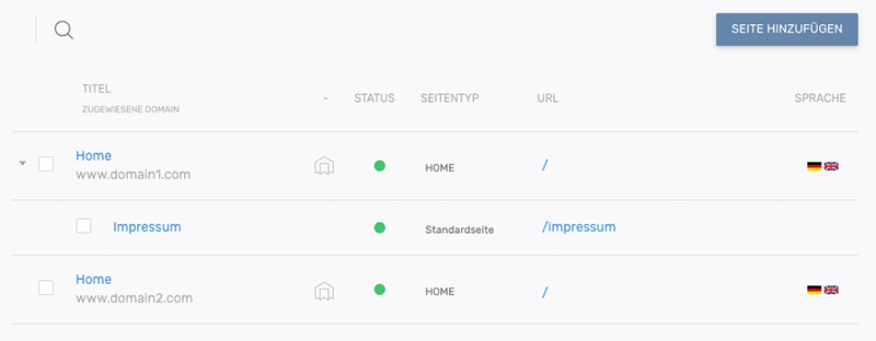 Die Zuordnung eines Seitenastes für Domain übergreifende Seitenbäume (Multidomain) funktioniert wie bei einer Domain, nur dass mehrere Home-Seiten für jede Domain existieren. Ein Multidomain-Seitenbaum mit Mehrsprachigkeit im Single-Tree-Modell mit mehreren Home-Seiten: