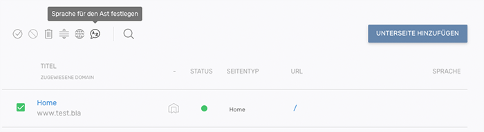 Dazu muss der Beginn des Astes ausgewählt sein (Checkbox der Seite aktivieren). Es erscheinen die Optionen für diese Seite. Durch Klick auf das Spracheinstellungs-Symbol () erscheinen die verfügbaren Sprachen. Die Sprache der untergeordneten Seiten wird automatisch auf die Sprache der übergeordneten Seite festgelegt.