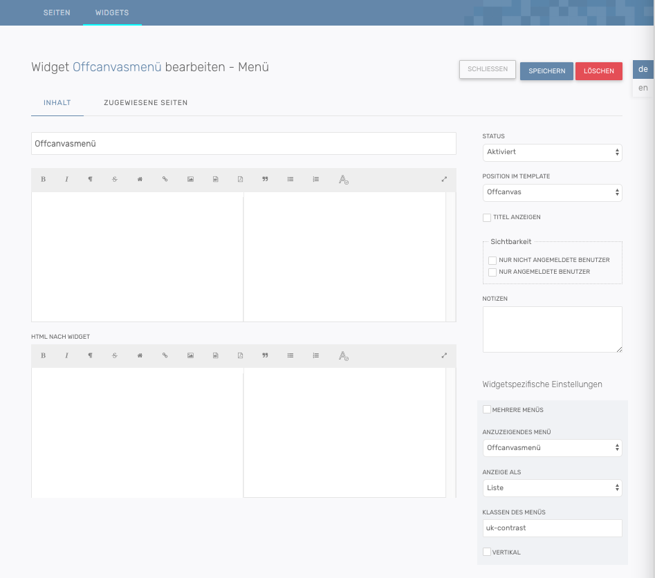 Die Zuweisung von Widgets zu einzelnen Seiten kann auch über die Detailansicht einer Seite unter dem Reiter Widgetzuordnung erfolgen. Eine genaue Dokumentation hierzu finden sie unter: Seiten
